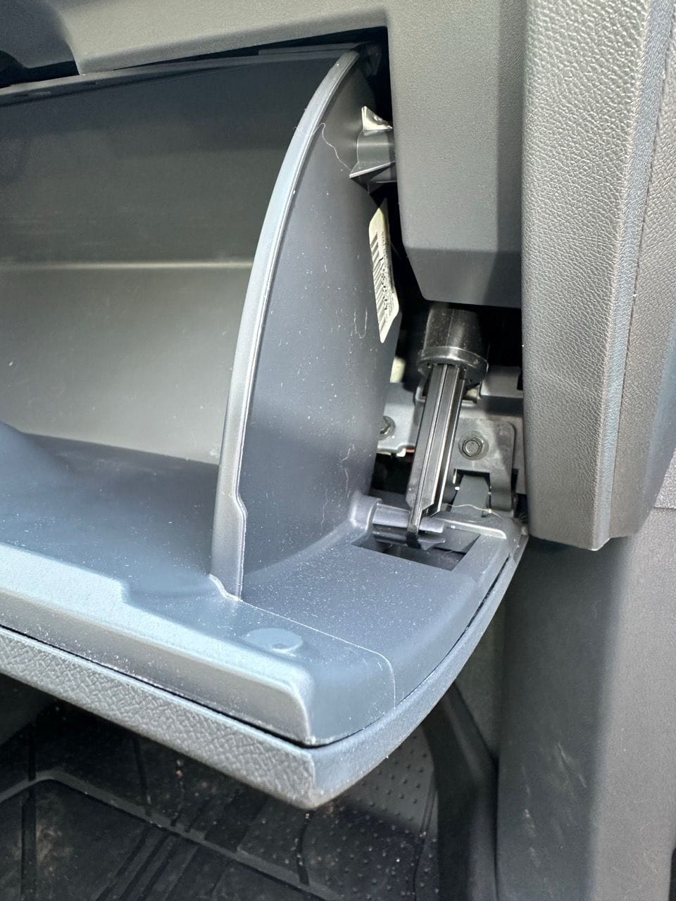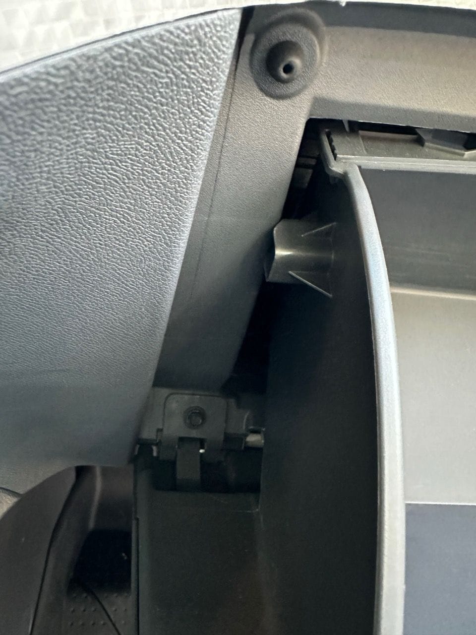 Squeeze the sides of the glove box inward so that the plastic stops on each side no longer catch, and the glove box cavity opens up completely.