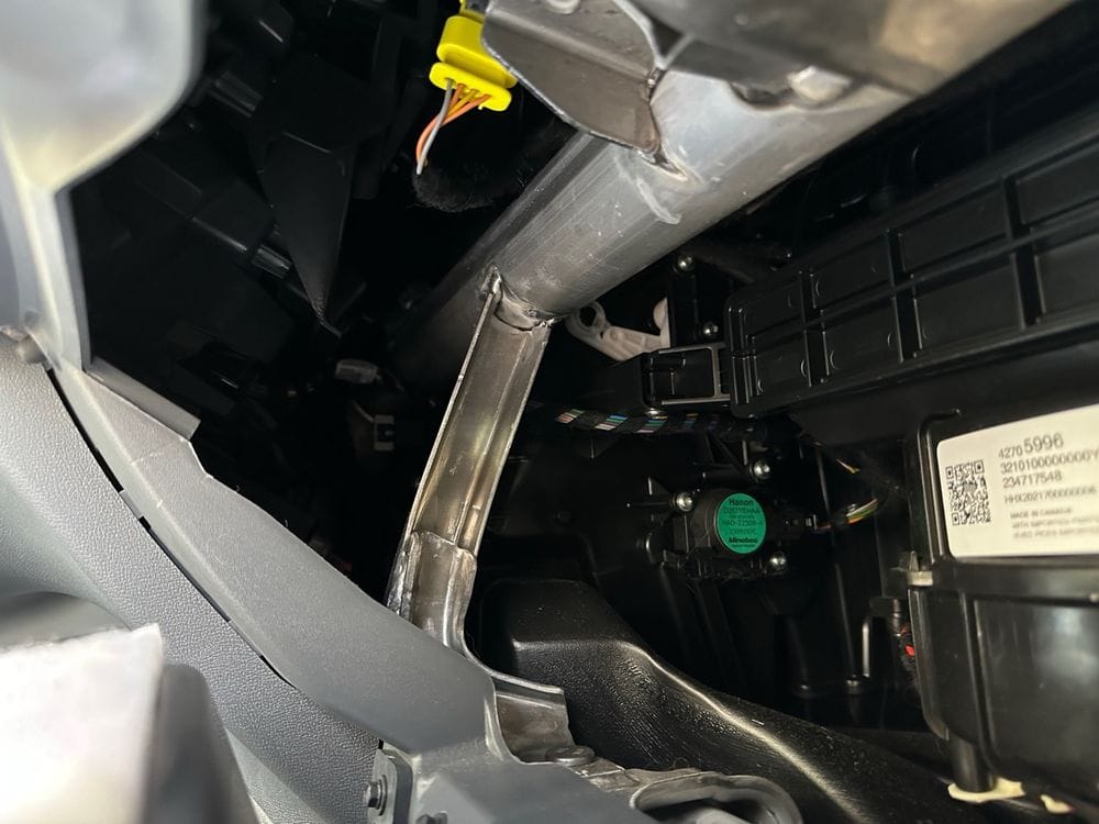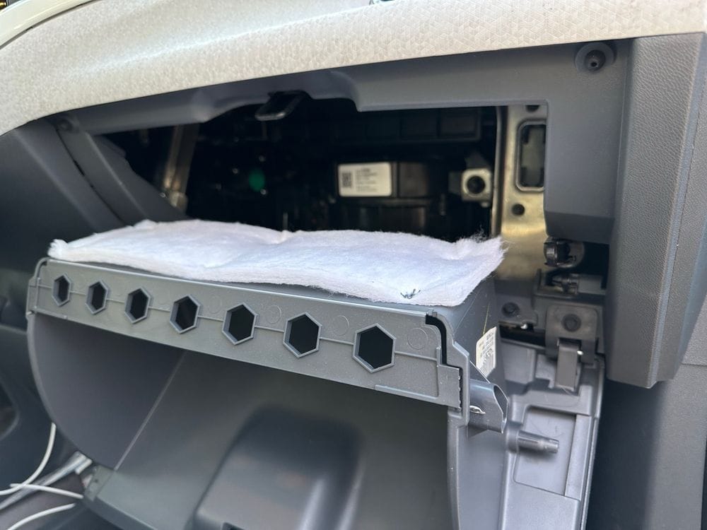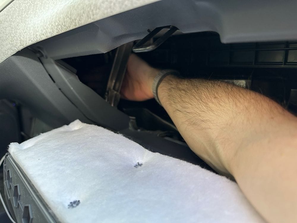 Gain access to the rear of the center console by removing the glove box. Pop open the glove box and remove the damper from the right side. This required pliers to pinch the clip so that it could slide off and took more sliding force than I expected.