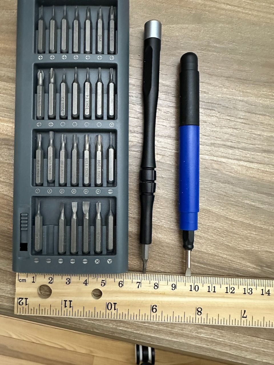 Turns out "small" means less than 18cm (5 inches) tall, with a very thin flat edge, 4mm (1/8th inch) wide. The electronics screwdriver set I have pictured below was just a little bit too tall to be effective, so I ended up using some "screwdriver pen" thing my wife had laying around.